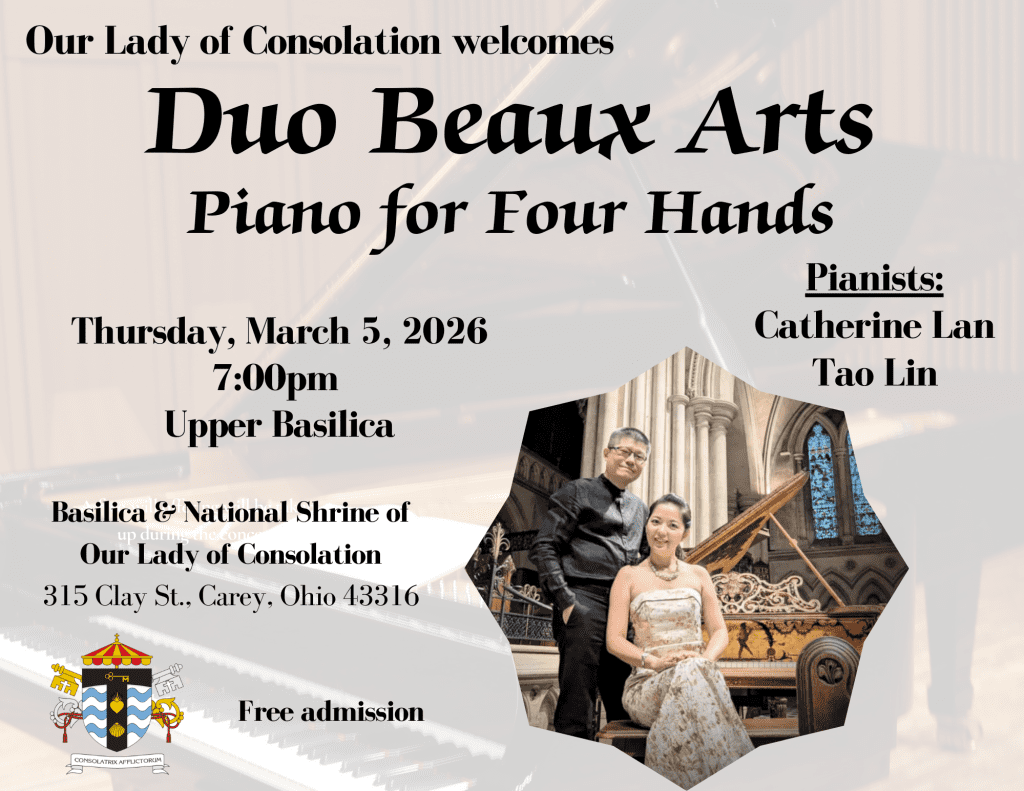 On Thursday, March 5 at 7:00pm, Our Lady of Consolation will welcome pianists Catherine Lan and Tao Lin of Duo Beaux Arts to play a concert of music for piano for four hands. Catherine Lan and Tao Lin, a husband and wife duo, are internationally acclaimed pianists.