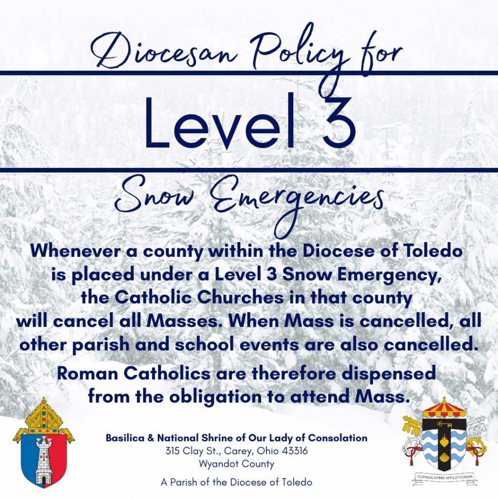 The Basilica & National Shrine of Our Lady of Consolation is within the boundaries of Wyandot County. If the Sheriff of Wyandot County declares a Level 3 snow emergency, all Masses as well as parish, shrine, and school events are cancelled until the Level 3 is lifted. The Gift Shop will also be closed.